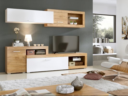 Преимущества: большая ниша для ТВ — для телевизора с диагональю от 50" и больше; стильное исполнение — насыщенный цвет натурального дуба делает мебель максимально привлекательной; настенный модуль — поможет сэкономить драгоценное свободное пространство в комнате, не пренебрегая практичностью. Для изготовления данной модели используется ЛДСП.