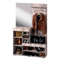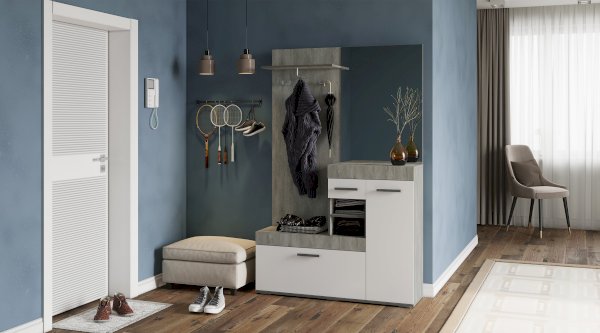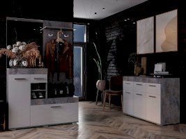 Небольшая, но стильная модель Инстайл станет прекрасным выбором для решения хранения в прихожей. Сочетание белого матового и фактуры бетона, а также наличие большого зеркала облегчают конструкцию и позволяют ей расширить пространство. Все створки, за которыми спрятаны полки для хранения вещей и обуви, оснащены эргономичными хромированными ручками.