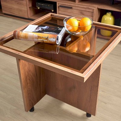 Небольшой мобильный журнальный столик на колесиках можно свободно передвигать по гостиной. Опорные боковые стенки образуют геометричный рисунок, который четко вырисовывается под столешницей из тонированного стекла, придавая столику выразительный облик. Рама, обрамляющая столешницу предотвратит падение предметов.