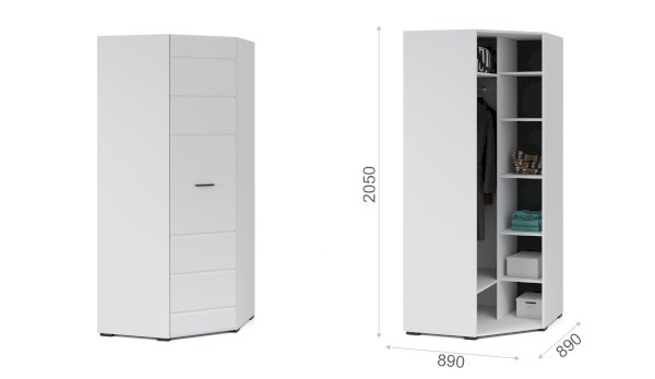 Угловой шкаф выполнен в современном стиле – сочетает в себе функциональность и эффектный внешний вид: строгая горизонтальная фрезеровка фасадов, ручки и задняя стенки контрастного черного цвета. Глянцевые белые фасады High Gloss из МДФ наполняют комнату светом, делают ее просторнее. Внутри предусмотрены секции для белья и отделение со штангой. Шкаф позволяет рационально использовать пространство и будет хорошо смотреться даже в небольшой комнате, служит связующим звеном для составления угловой системы хранения. Идеально компонуется со всеми модулями системы Йорк.