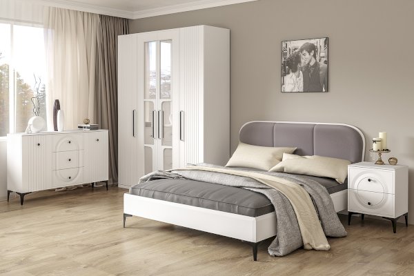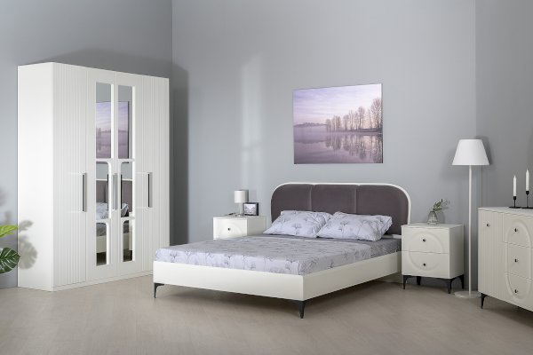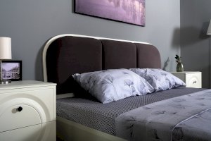 Кровать установлена на высокие ножки, что делает конструкцию лёгкой и воздушной, изголовье кровати декорировано пышным мягким элементом. Матрас укладывается на ортопедическое основание с гнутоклееными ламелями.