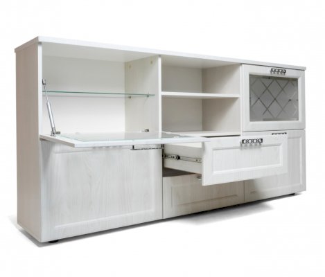 Дизайн комода функциональный и эстетичный. В конструкции все продумано до мелочей: есть два выдвижных ящика для небольших предметов, две открытые полки предназначены для предметов, которые хочется оставить на виду. Дверки со стеклом придают легкость. просторная столешница может послужить как для размещения телевизора, так и для любимых книг, статуэток и других аксессуаров.
