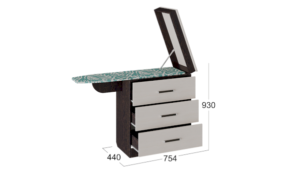 Комод выглядит компактно, он имеет 3 вместительных выдвижных ящика, которые позволят использовать 100% внутреннего пространства. Главное преимущество комода – встроенная гладильная доска, она находится внутри откидной крышки, благодаря чему комод выглядит компактно и зрительно не загромождает комнату.