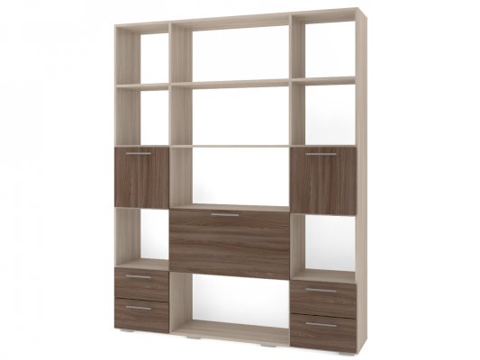 Применение задней стенки из ЛДСП (в ячейках с ящиками и фасадами) позволяет использовать данный стеллаж для зонирования пространства (чтобы предотвратить опрокидывание, необходимо обеспечить крепление стеллажа к стене).