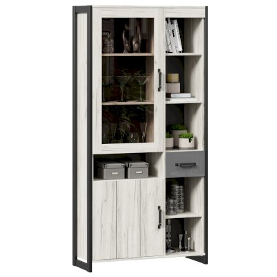 - Слева отделение шириной 540 мм. Вверху за распашной рамочной дверью со стеклом ниша с 2-мя полками из ЛДСП. Размер каждого отделения 540х334 мм.
