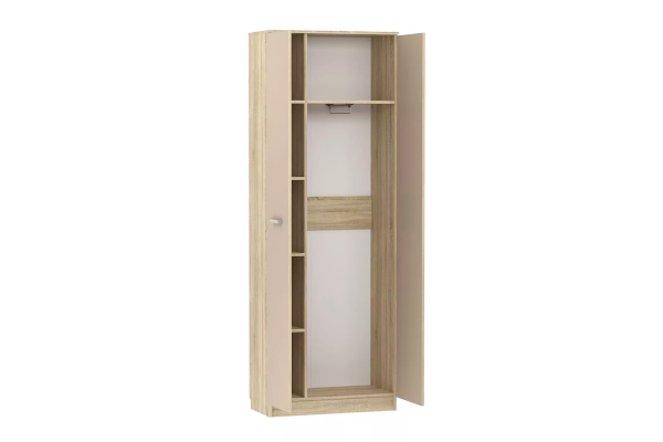 Внутри модуля предусмотрена выдвижная штанга для одежды на вешалках. Компактная, но очень вместительная модель шкафа с пятью полками, позволит разместить вещи и игрушки.  Классические глухие фасады надежно защитят содержимое шкафа от влаги и пыли.